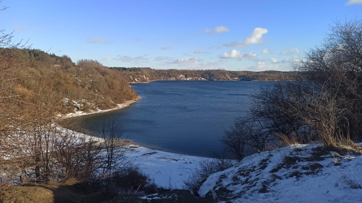 История одного из красивейших озёр Калининградской области началась, как, впрочем, многое на этом побережье с добычи янтаря. Именно здесь на расстоянии 500 метров от моря на том же Пальмникенском месторождении, то есть вблизи посёлка Гросс Хубникен в 1912 году был заложен крупный карьер глубиной 50 м – карьер «Вальтер», эксплуатировавшийся около 60 лет. С него начался опыт открытого способа добычи янтаря.
